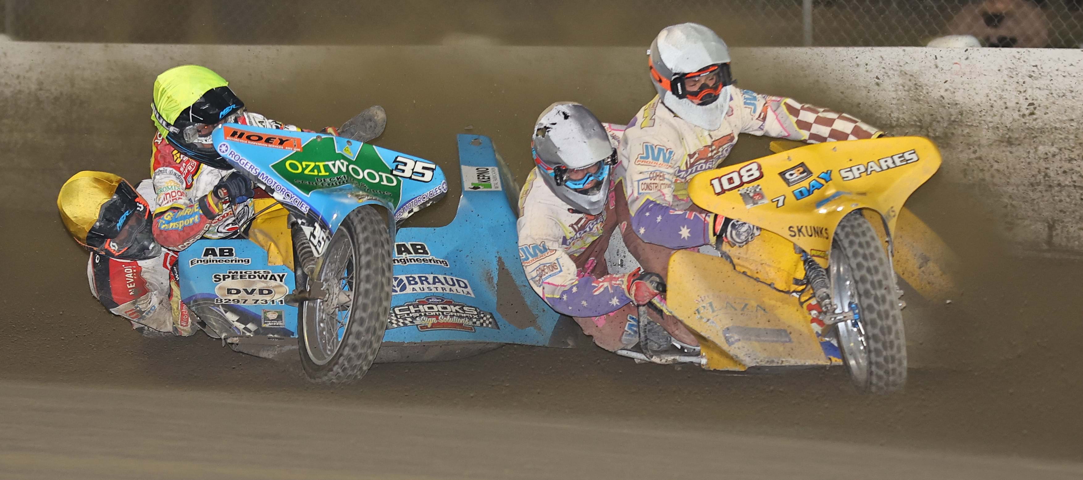 Sidecars: 20 heats. Highest 8 point scorers qualify for the championship night. 08-Chris Walker/April Cottrell (Vic), 12-Brian Silvy/Damian Egan (SA), 13-Trent Headland/Darryl Whetstone (SA/Vic), 14-Kym Menadue/Shane Dolan (SA), 15-Shane Rudloff/Scott Morris (SA), 16-Jack Summerling/Martin Wilde (NSW), 35-Mark Mitchell/Tony Carter (SA/Vic), 36-David Bottrell/Darcy Risstrom (Qld/Vic), 40-Damien Niesche/Ayrton Canning (SA), 50-Stuart Firth/Tim Green (Qld), 50-Byren Gates/Eli Bock (Vic), 69-Rick Stephens/Nick O’Brien (NSW/SA), 108-Max Howse/Riley Commons (NSW), 256-Paul Hemsworth/Adam Botham (NSW), 684-Jake Treloar/Eli Wright (NSW), 707-Stephen Saunders/Duane Dennis (NSW/Qld). Reserves: 970-Dean Hobbs/Daniel Low (SA), 82-Wayne Lethbridge/Grantley Simounds (SA), 47-Deven Gates/Megan Cane (Vic)