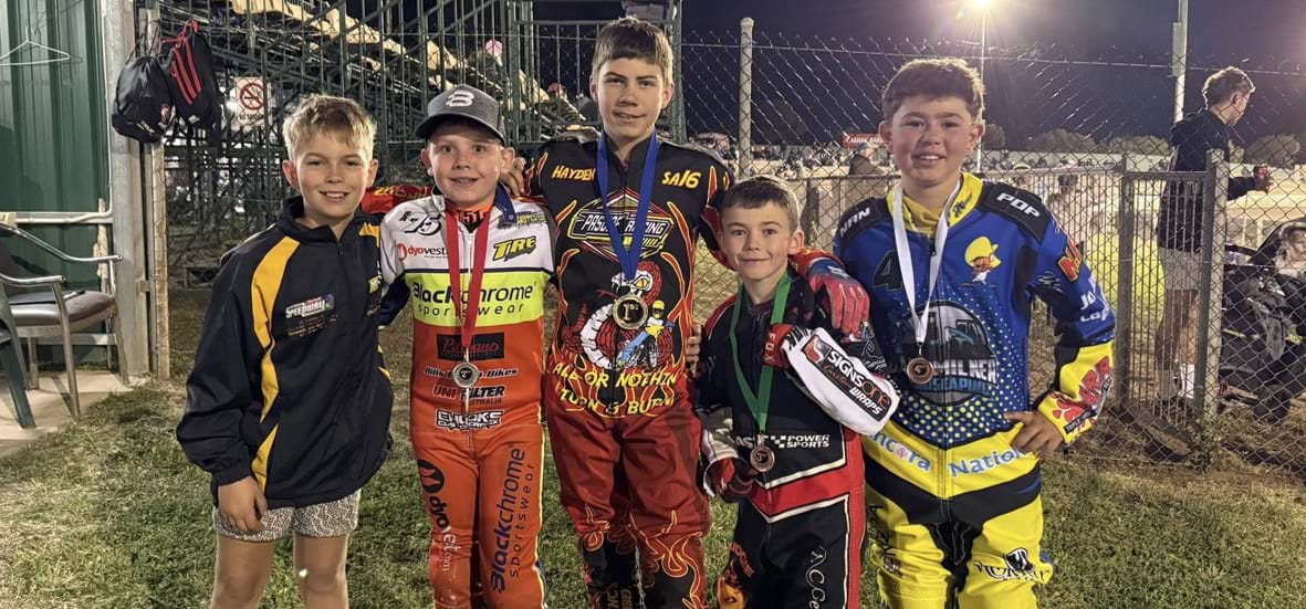 The Under 16 250cc Solos produced probably the best racing of the night with Cooper Antone, Kobi Canning and Nate Smith wheel-to-wheel in every race. Smith, from Echuca in Victoria won the first two heats, then local rider Canning won the third, before Antone, from Table Top in New South Wales, won the fourth. Thirteen-year-old Antone was lucky to even make that race as his bike failed and he had to swap bikes and ride across the infield to get to the tapes with just 16 seconds to spare, but he then backed up by winning the final with Smith second, Canning third and Ruby Chapman fourth.