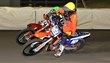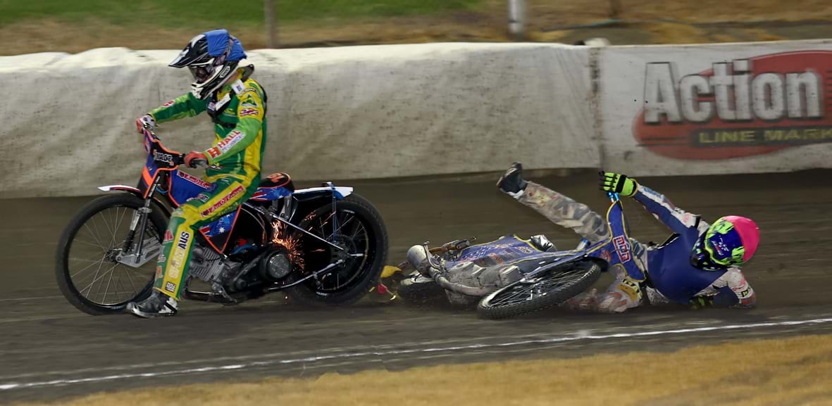 McGuinness and May were side by side through turn one but then May, on the outside, fell heavily and his bike crashed into the fence. There were concerns May might have injured a shoulder he’s had trouble with in the past but he was okay. Not so his bike, however. The referee was willing to have all five back in the rerun but May’s bike was too badly damaged and he was out for the night. In the rerun McGuinness lost a chain in a shower of sparks going into turn one and Sampson had to lay his bike down to avoid running into him. In the second rerun, without McGuinness, Pedler was second and fell in turn one, lap two and Sampson had to lay his bike down again. Unfortunately his bike gave her a hefty bump in the back. He was very concerned about hitting her but, although bruised, she still took her other two rides. Martin won the second rerun from Sampson, but full credit to Sampson. The guy was just a couple of days shy of his 57th birthday but his reactions were quick enough to get the bike down twice in a couple of minutes, and throwing a bike onto the track wouldn’t be much fun at 57. But, like Pedler, he kept going and was rewarded with 6 points. A nice little earner considering he usually has to ride against international riders which makes winning any prizemoney very difficult.