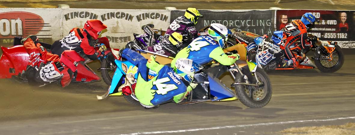 Shane Hudson and Mitchell Spear won an exciting final of the Chook’s Custom Grafix Gillman Sidecar Championship on Saturday night, although all the excitement was behind them as Rick Stephens/Nick O’Brien, Kym Menadue/Shane Dolan and Nate Headland/Jaxon Rayner constantly exchanged places in a hectic battle for second place before finishing in that order.