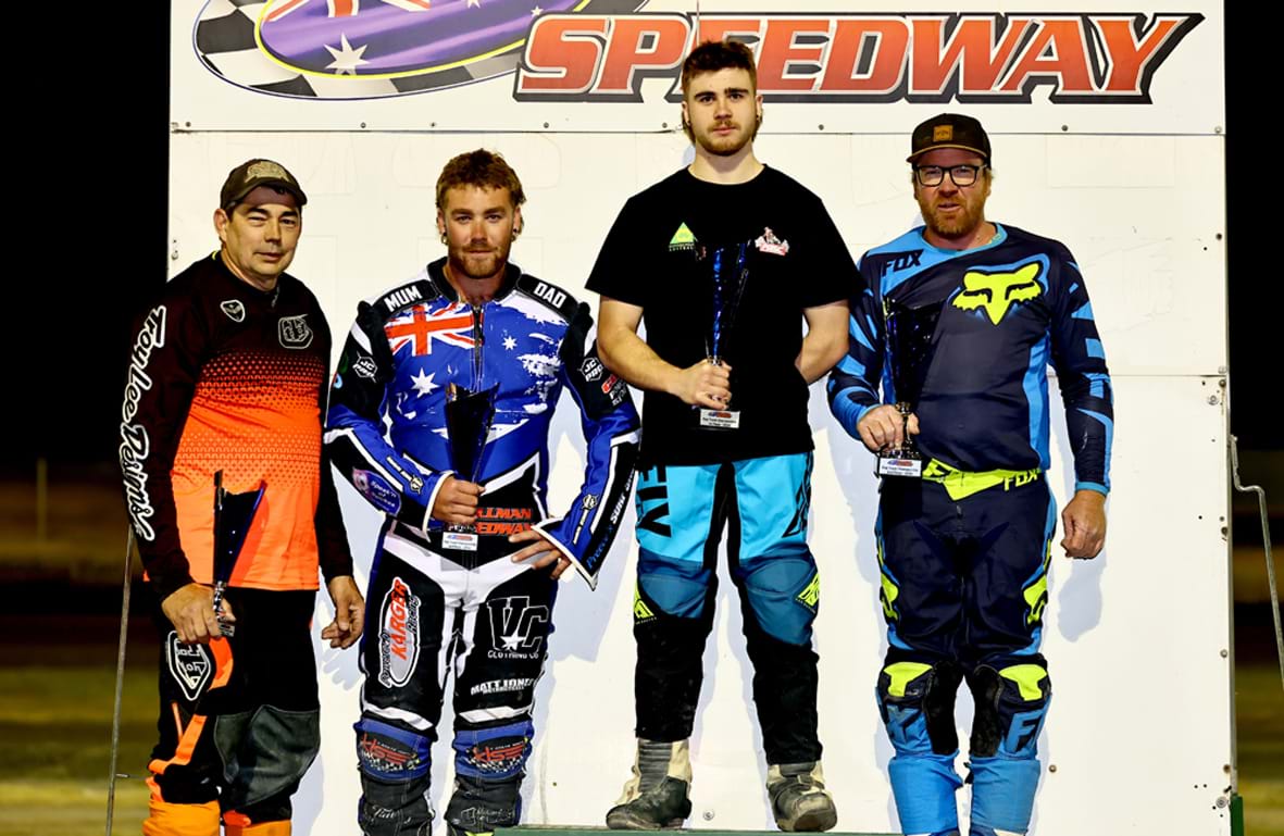 It was a strong line-up with May a current speedway rider and Sadler, Stout and Chapman all former riders, but it was 19-year-old dirt track rider Kyle Machin who took the win after a close race with Sadler who finished second. May was third, Stout fourth and Knights fifth with Chapman a non-finisher.