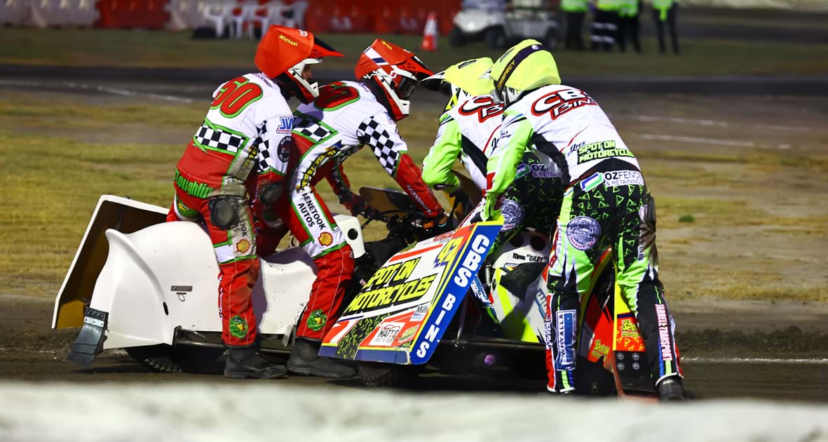 Top scorers in the Sidecar heats were Mildura’s Byren Gates and Michael O’Loughlin, although technically Gates lives across the river at Gol Gol in New South Wales! Gates and O’Loughlin scored a maximum 12 points from their four rides to finish ahead of Josh Pascoe/Greg Black on 10 and Justin Plaisted/Damian Egan and Malcolm German/Cameron White on 9.