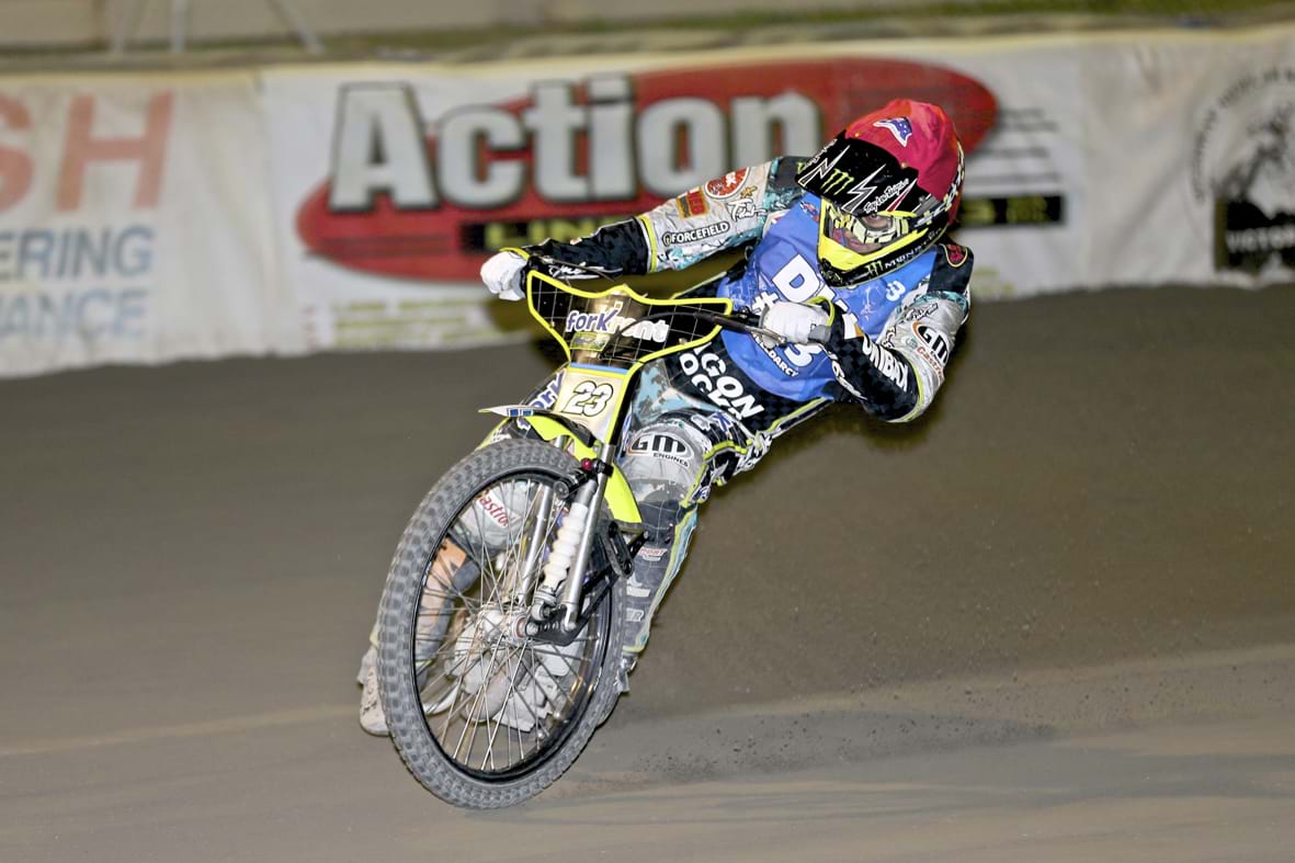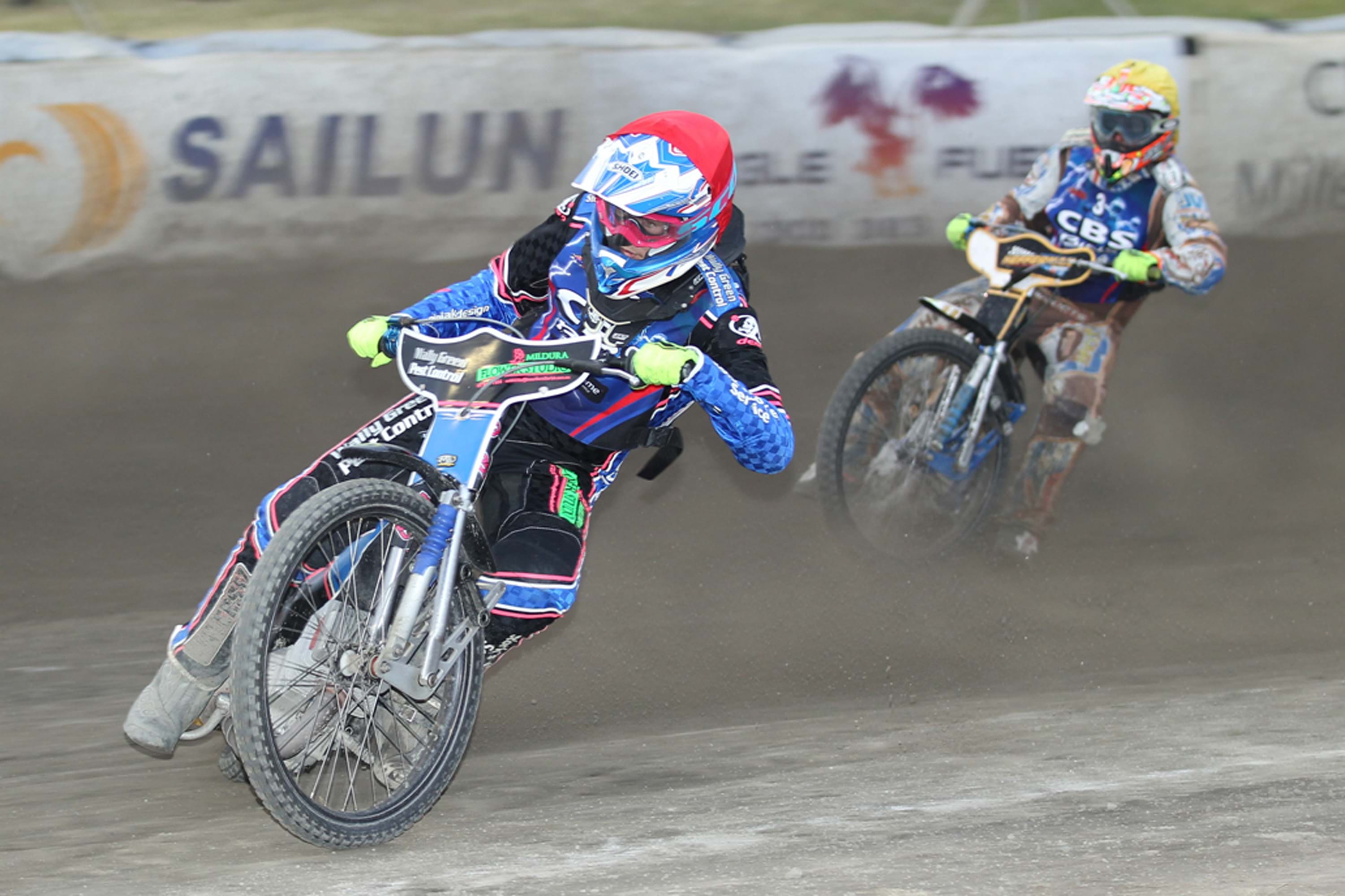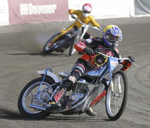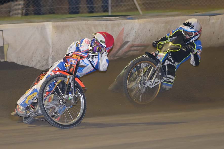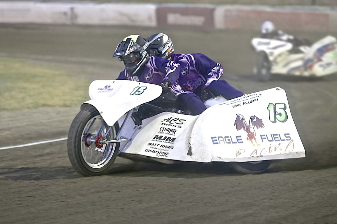 Some hot racing compensated for the very cold weather in an entertaining meeting at Gillman Speedway on Saturday night (14 November), and staff of the meeting sponsor, Eagle Fuels, went home happy when their sponsored pair, Simon Hartley and Travis Debono (pictured above), won the main event, the Group One Sidecar Final...