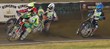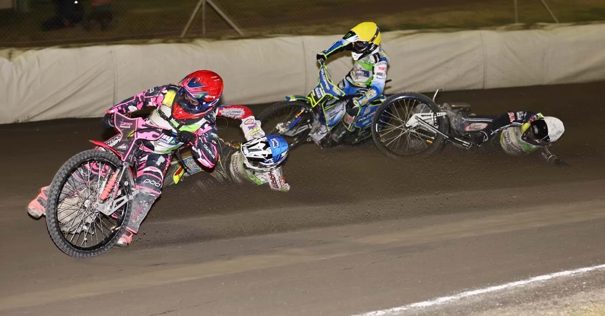 In a tight first turn Pearson (red), Zischke (blue) and Turner (white) where shoulder-to-shoulder, with contact between the three and Zischke and Turner fell and Lidsey (yellow) got caught up in the melee. He just missed getting taken out by Turner’s bike but Zischke and his bike slid straight into his path and he crashed over the top and into the fence. Zischke and Lidsey were both down for quite some time, Zischke with his leg trapped between the front wheel and the bike. All four were allowed in the rerun but Lidsey was unable to start and was out for the rest of the night with a suspected broken wrist. Despite the crash Zischke not only rode in the rerun but won and was again very quick, only nine-tenths of a second slower than Fricke’s time in the previous heat.