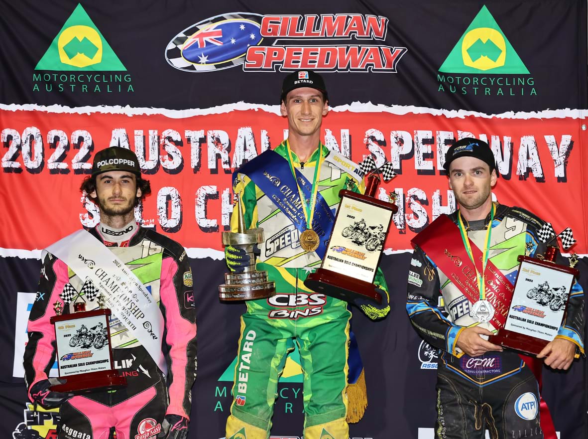 The Title, which was the 2020/21 title postponed from last season, was Fricke’s third, and it was also the third time on the podium for Sedgmen but unfortunately 17-year-old Zischke didn’t get to join his fellow teenage Queensland debutant Rew on the podium as he crashed into Sedgmen’s back wheel in turn one after the finish and was thrown into the fence and taken to hospital, apparently with concussion.
